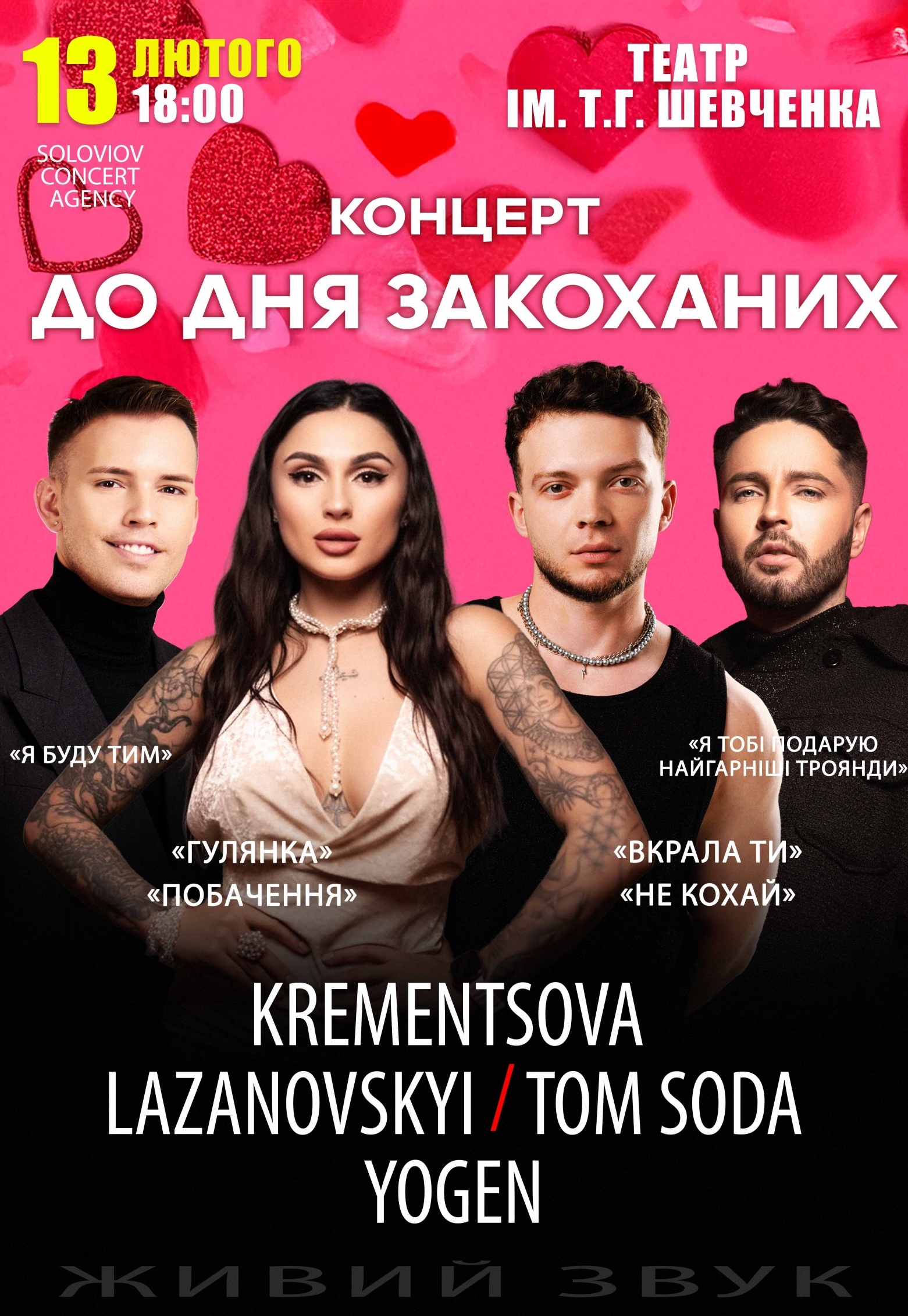Особенный праздничный концерт ко Дню влюбленных! В программе исполнители: Krementsova, Lazanovskyi, Tom Soda, Yogen.