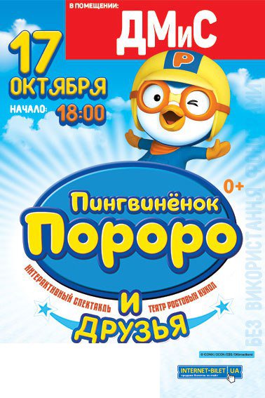 Интерактивный спектакль "Пингвиненок Пороро и друзья" состоится 17 октября 2016, 18:00, понедельник в Дворец молодежи и студентов КТУ. С помощью сервиса internet-bilet.ua, Вы сможете с легкостью забронировать, заказать и купить билеты на интересующий Вас концерт, спектакль, оперу, балет, мастер-классы, спортивные и детские мероприятия, оплатив их самым удобным для Вас способом: через интернет банковской картой VISA/MasterCard, наличными или курьером, если сделаете заказ билета c доставкой.