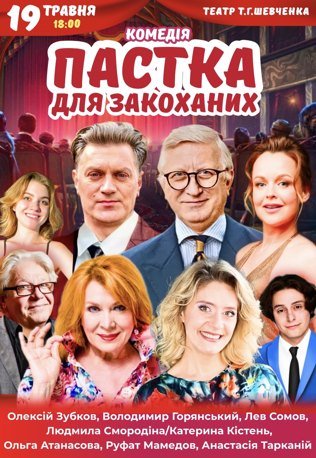 Вистава "Пастка для закоханих" відбудеться 19 травня 2026, 18:00, вівторок в Театр драми та музичної комедії ім. Тараса Шевченка. За допомогою сервісу internet-bilet.ua, Ви зможете з легкістю забронювати, замовити та купити квитки на концерт, спектакль, оперу, балет, майстер-класи, спортивні та дитячі заходи, що Вас цікавлять, оплативши їх найбільш зручним для Вас способом: через інтернет банківською карткою VISA/MasterCard, готівкою або кур'єром, якщо зробите замовлення квитка з доставкою.